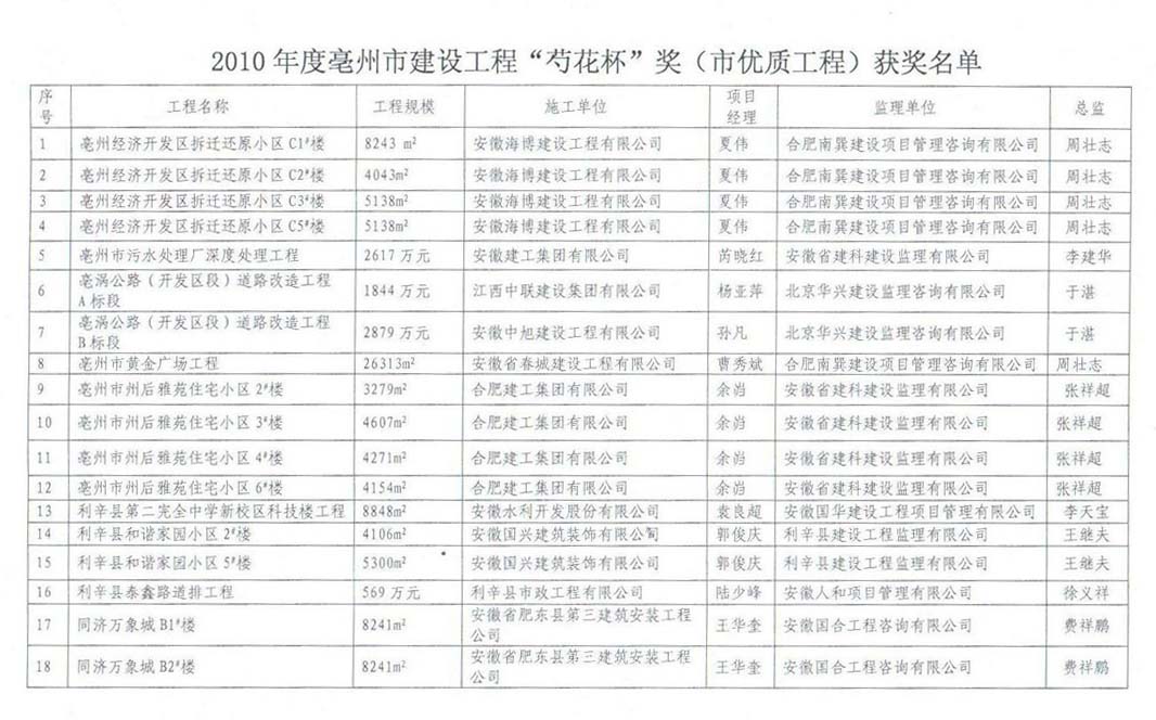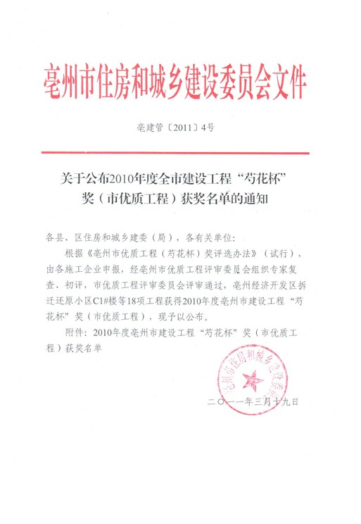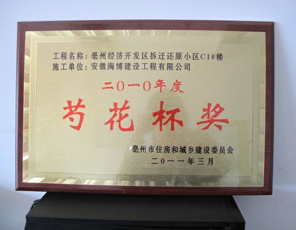 熱烈祝賀由安徽海博建設工程有限公司亳州項目部承建的亳州經濟開發區拆遷還原小區C1#、C2#、C3#、C5#號樓四個單位工程榮獲2010年度亳州市優質工程“芍花杯”獎。