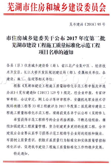 2017月12月15日,由蕪湖市、無為縣建設(shè)工程質(zhì)量監(jiān)督站及相應(yīng)專家組成的評審組,按照《蕪湖市建設(shè)工程施工質(zhì)量標(biāo)準(zhǔn)化示范工程申報及評選辦法》(蕪市建通知[2015]129號),對該工程申報蕪湖市建設(shè)工程施工質(zhì)量標(biāo)準(zhǔn)化示范工程進(jìn)行現(xiàn)場復(fù)審。