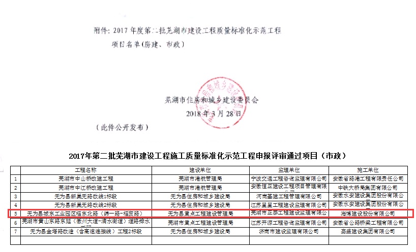 2018年03月28日,蕪湖市住房城鄉(xiāng)建委公布了我公司承建的無為縣城東工業(yè)園區(qū)福東北路(緯一路-福貿(mào)路)工程榮獲“2017年度第二批蕪湖市建設(shè)工程施工質(zhì)量標(biāo)準(zhǔn)化示范工程”稱號。