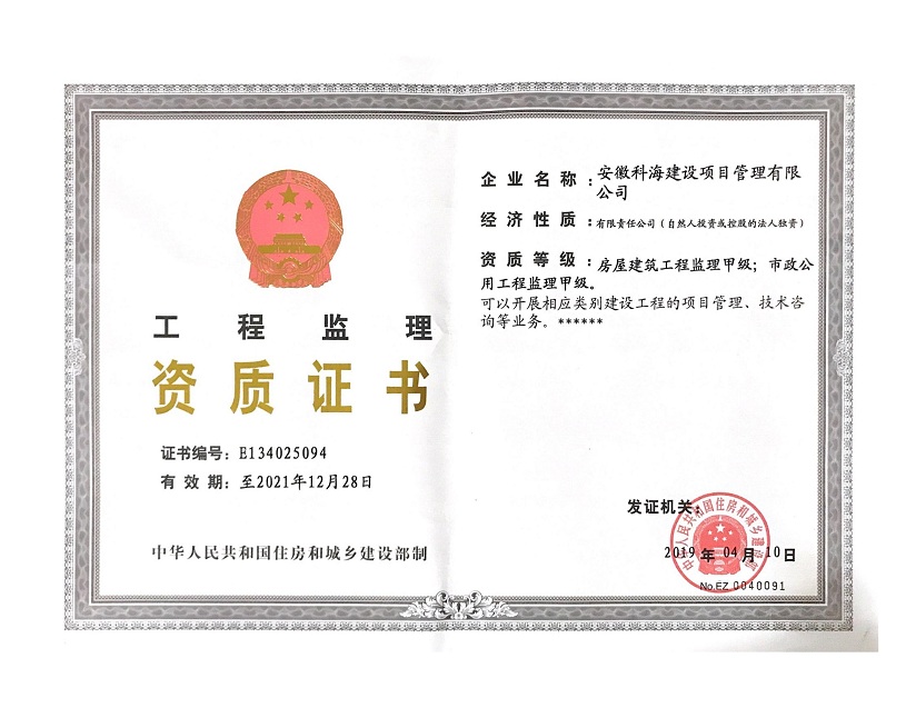 安徽科海建設項目管理有限公司現有國家級監理資質為:水利工程施工監理甲級、房屋建筑工程監理甲級、市政公用工程監理甲級。
