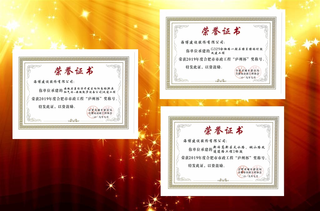 近日,由我公司承建的G329合相路一期石塘至塘林村段改建工程(總造價(jià)11338萬元)、新站高新區(qū)天水路、桃山路改造道路工程1標(biāo)段(總造價(jià)2371萬元)及安徽居巢經(jīng)濟(jì)開發(fā)區(qū)向陽南路改造工程(總造價(jià)1108萬元)三個(gè)項(xiàng)目喜獲2019年度合肥市市政工程“廬州杯”獎(jiǎng)稱號。“廬州杯”獎(jiǎng)是合肥市市政工程質(zhì)量最高獎(jiǎng)項(xiàng),該獎(jiǎng)項(xiàng)是由合肥市市政工程協(xié)會組織,經(jīng)單位申報(bào)、部門推薦、資料初審、形式審查、現(xiàn)場復(fù)查、建委等相關(guān)部門研究、網(wǎng)上公示等程序產(chǎn)生,層層篩選、好中選優(yōu)、優(yōu)中選精。