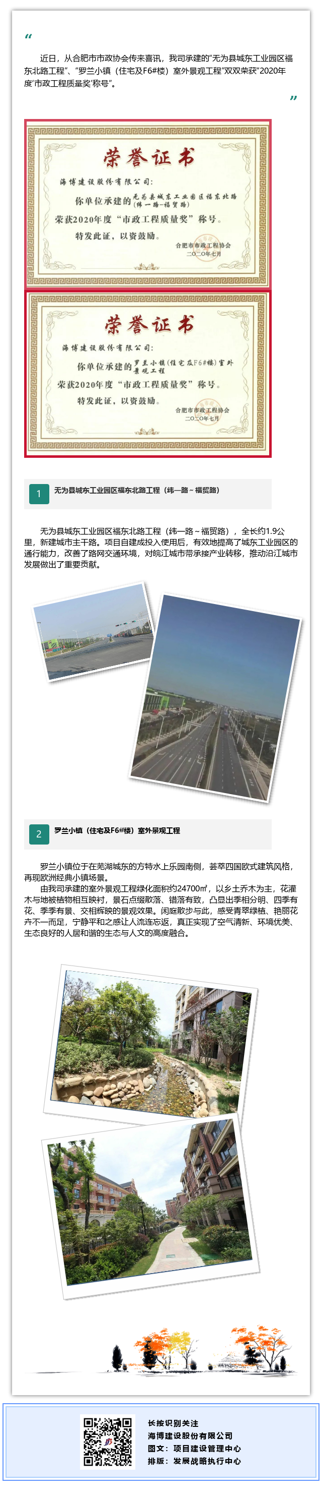 公司兩項目喜獲合肥市“市政工程質量”獎