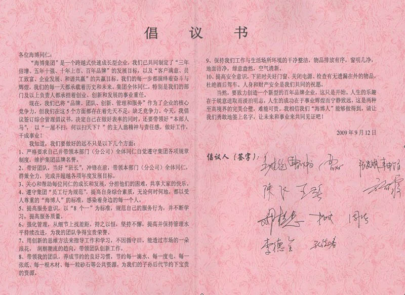 9月12日下午,公司領(lǐng)導(dǎo)及各部門負責(zé)人集體在公司發(fā)起的“提高綜合管理水平及自身素養(yǎng)”的倡議書上簽字,號召公司全體員工以更高標準要求自己,以“一屋不掃,何以掃天下?”的主人翁精神和責(zé)任感,做好工作,提高業(yè)務(wù)水平和自身素養(yǎng),做一個受人尊敬的“海博人”。
